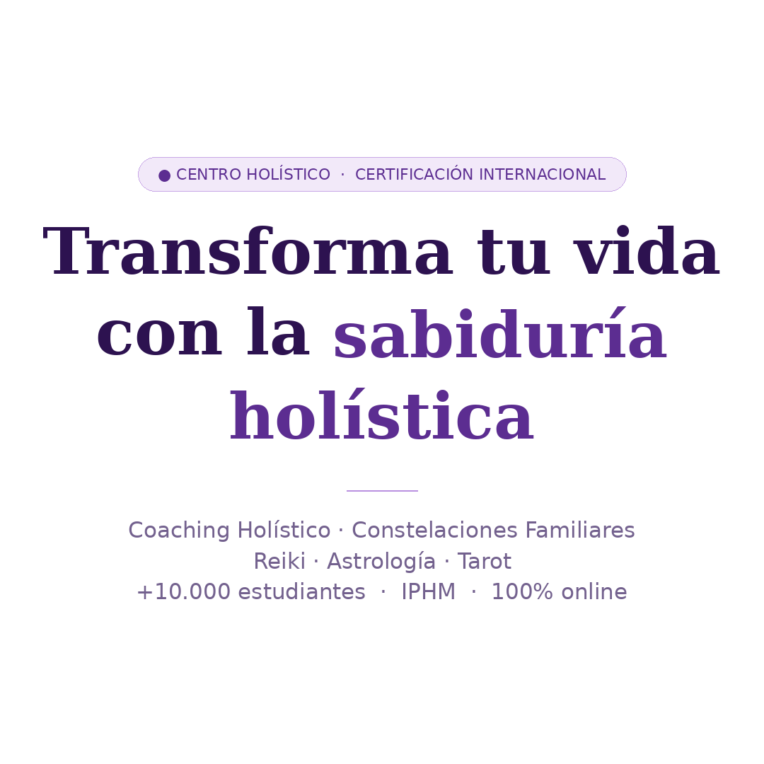 Ofrecemos formaciones online en Constelaciones Familiares, Coaching Holístico, Reiki, Astrología y Tarot, diseñadas para transformar vidas. Aprende a liberar bloqueos emocionales, acompañar procesos de cambio, canalizar energía, interpretar cartas natales y dominar el arte del Tarot desde cualquier lugar.