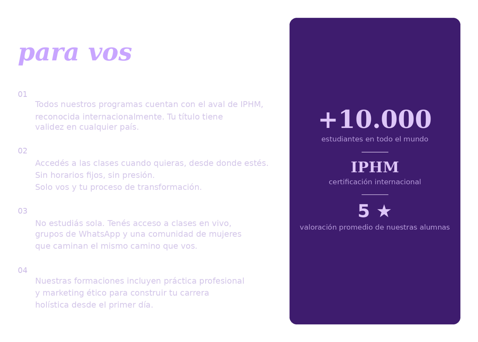 Todos nuestros programas cuentan con el prestigioso reconocimiento de IPHM, asegurando validez profesional en cualquier lugar del mundo. Con más de 4600 egresados, nuestras formaciones están diseñadas para que puedas vivir al 100% de tu rol como terapeuta.