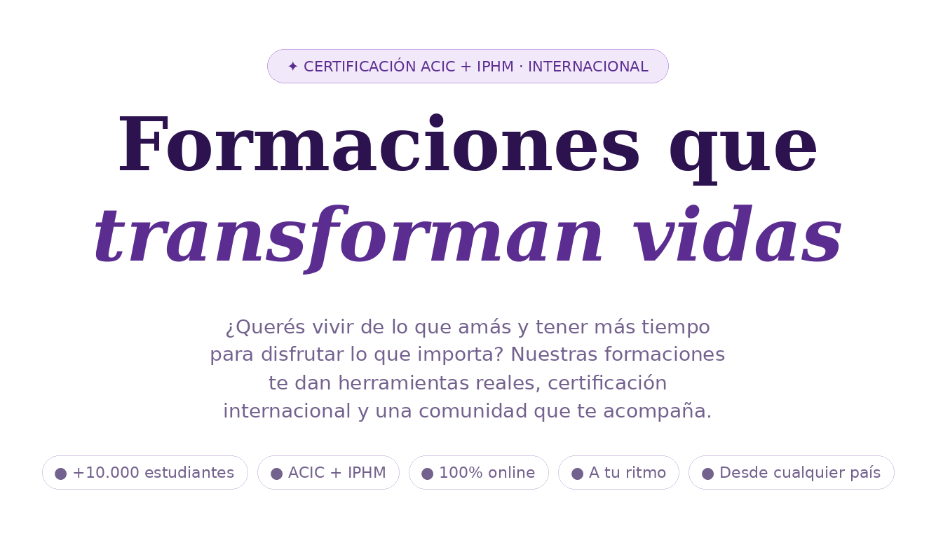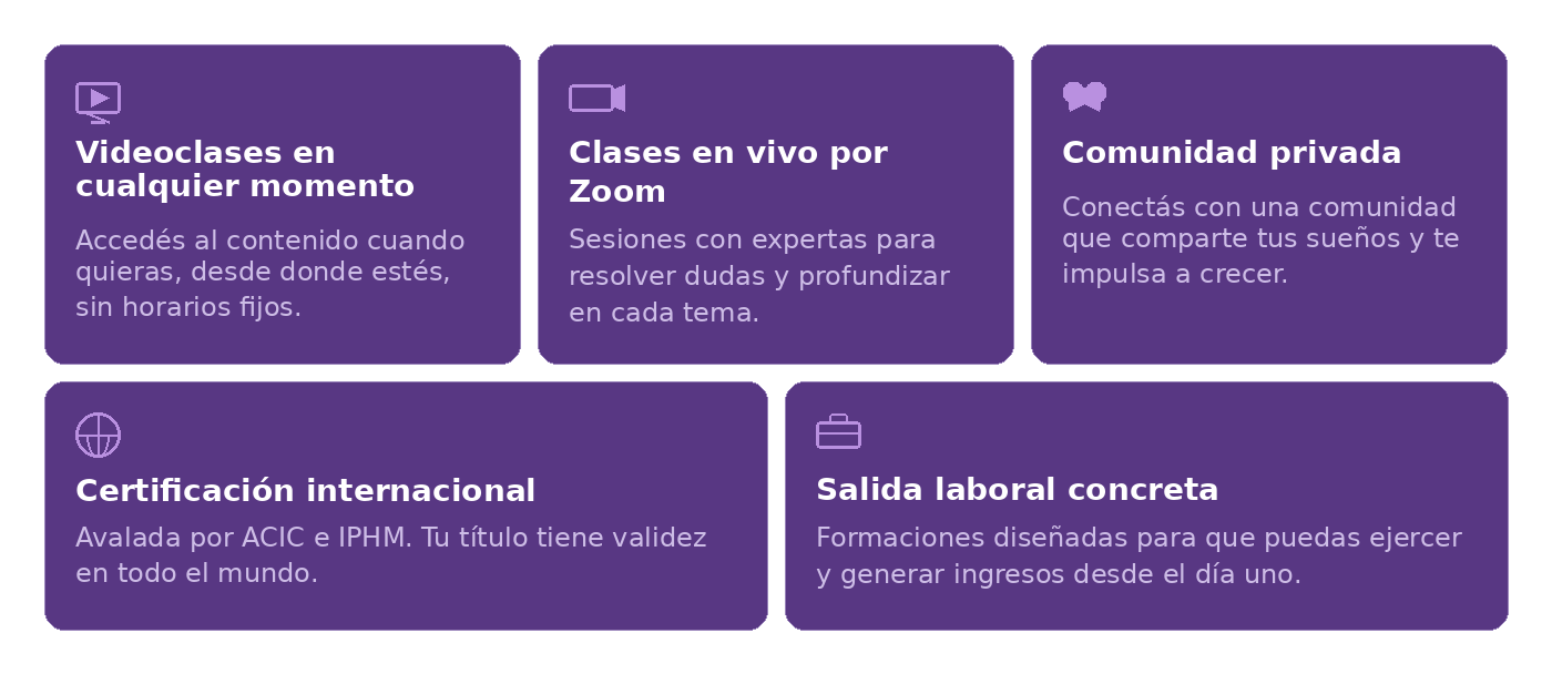 Formación certificada internacionalmente (ACIC + IPHM). 10 meses, clases grabadas + vivos en Zoom, comunidad privada y salida laboral real. Inicio 10 de junio. ¡Asegurá tu lugar hoy!